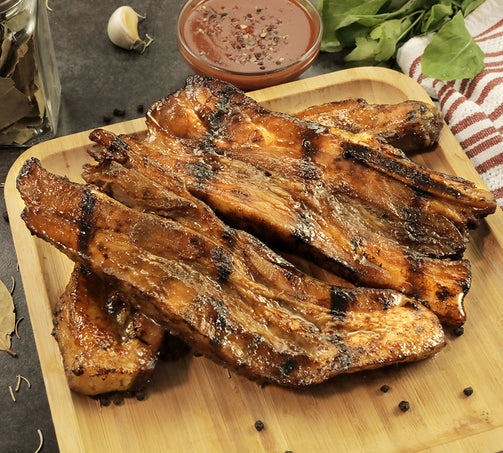 Tender pork belly marinated in sweet and savory barbecue marinade. May be served grilled or fried.